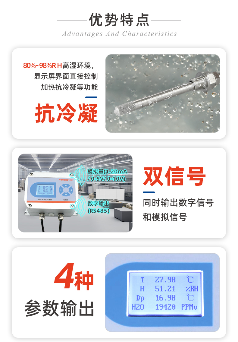 ●模擬量輸出:?溫度+濕度(露點值僅供參考)4~20mA/0-5V/0-10V(三選一)
